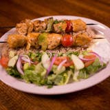 Marinated chicken cubes charbroiled on a skewer with green peppers and tomatoes. Served on a bed of rice and house salad.